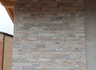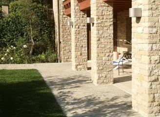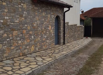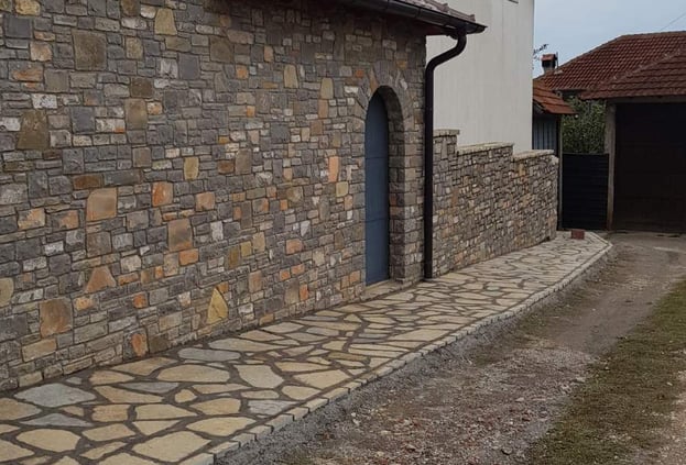 Rivestimento in pietra locale con pavimentazione in pietra indiana gialla a mosaico