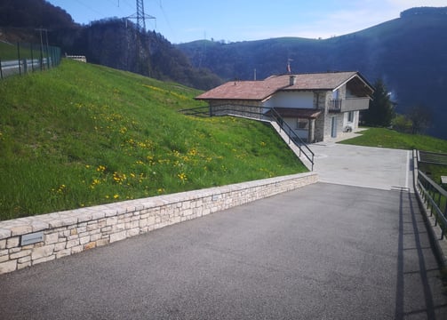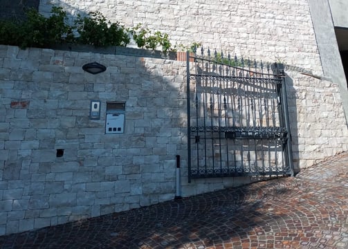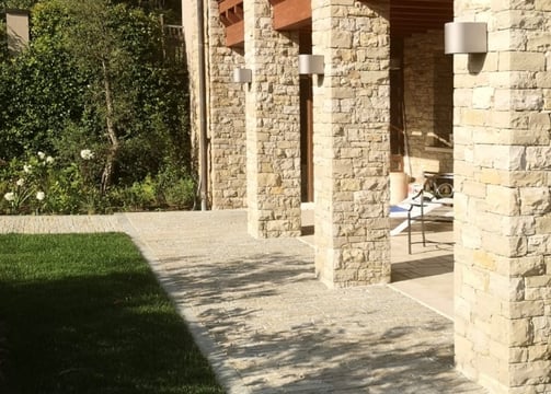 Rivestimento in pietra di Trani con posa semisecco e pavimentazione in cubetto di porfido rosso